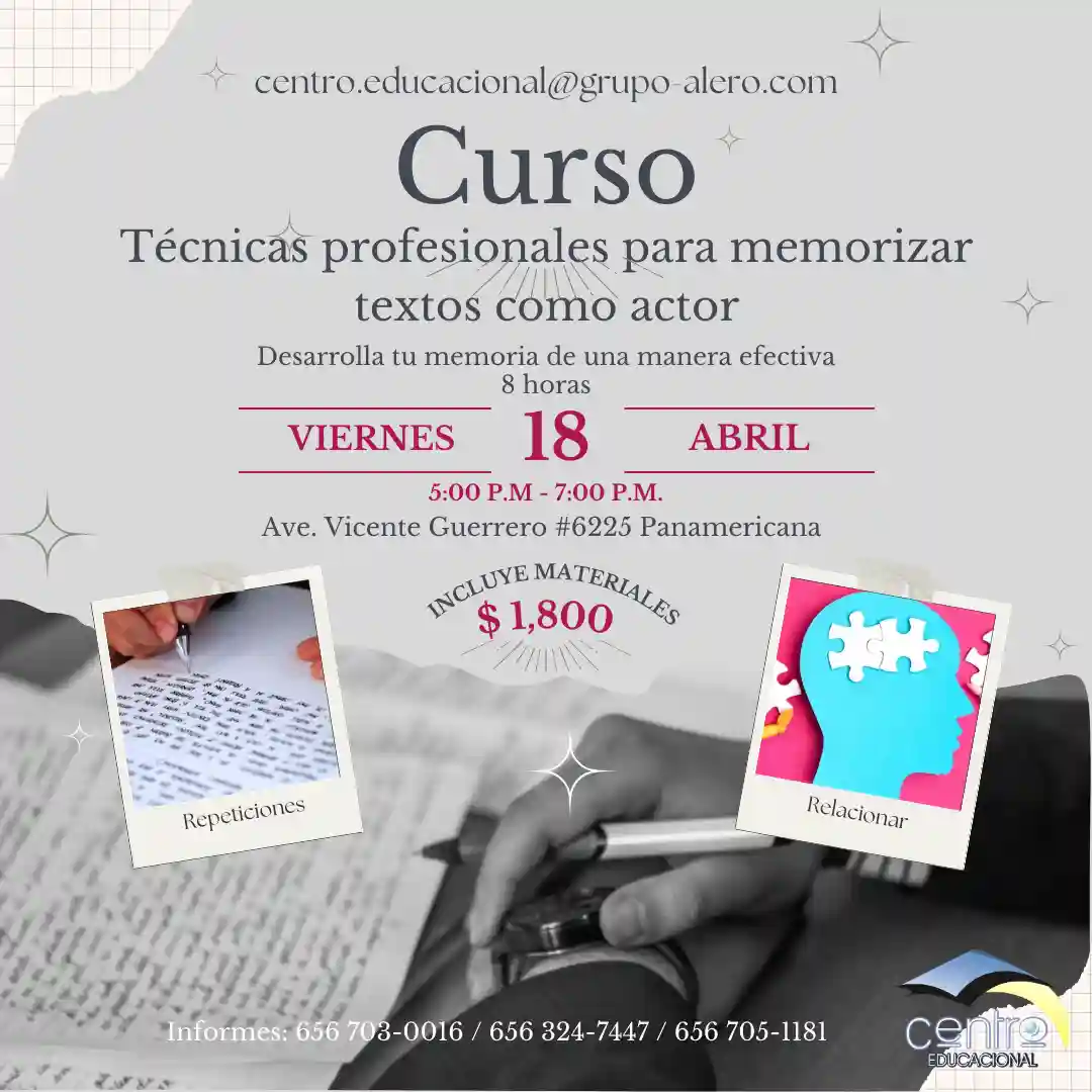 ¡Taller Intensivo de Técnicas Profesionales para Memorizar Textos! Desarrolla tu memoria y lleva tu interpretación al siguiente nivel con herramientas efectivas para recordar diálogos con precisión y naturalidad. Dirigido a: Actores, Locutores, Directores de teatro y cine, Comediantes… ¡y cualquier persona interesada en mejorar su capacidad de memorización! Impartido por el Mtro. Christopher Cruz Especialista en técnicas de memorización para artistas Informes e inscripción: 656 703-0016 / 656 324-7447 / WhatsApp 656 705 1181. ¡No te quedes fuera, CUPO LIMITADO!