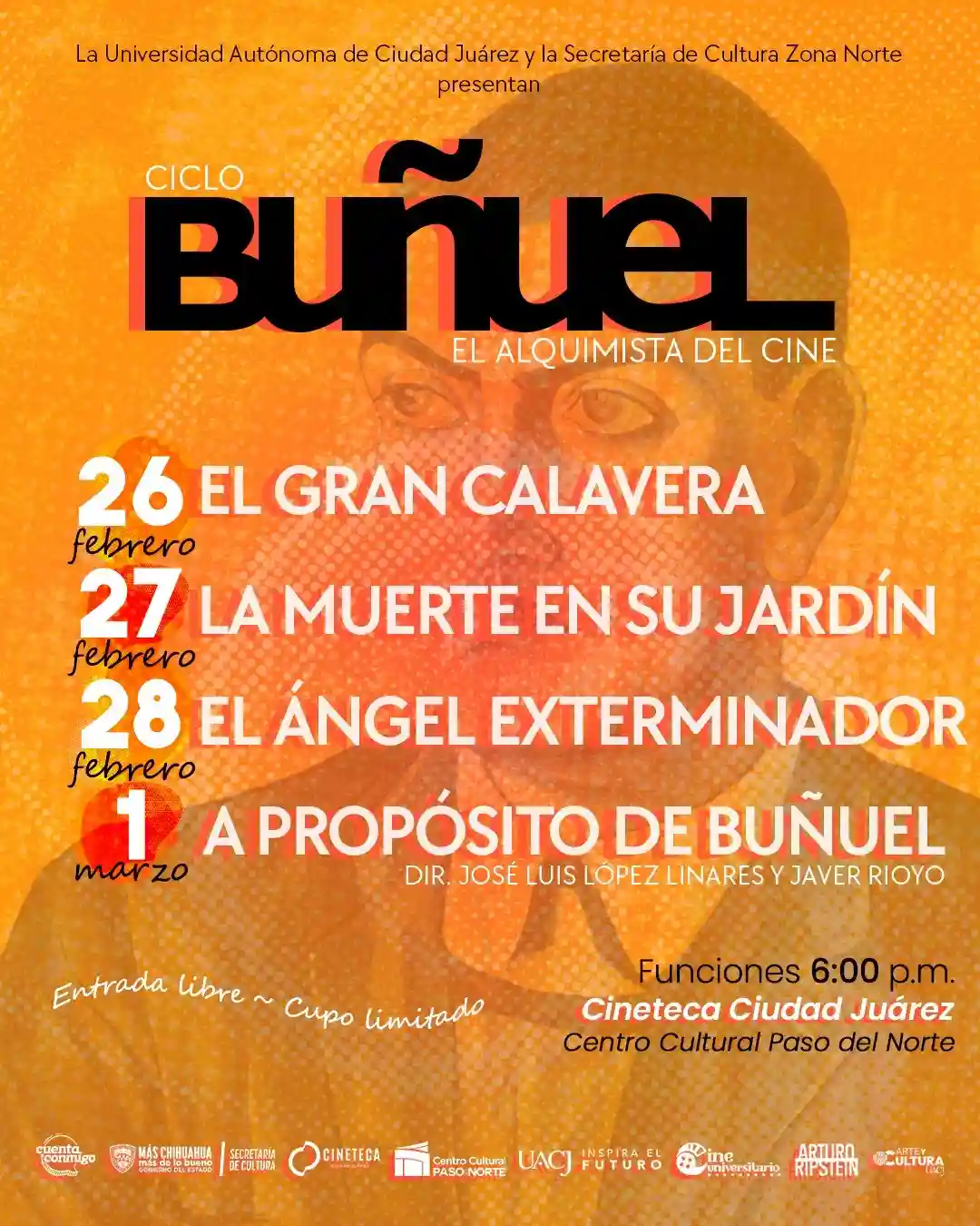 Esta semana, la Cineteca Paso del Norte y Cine Universitario UACJ unen fuerzas para ofrecer un ciclo imperdible dedicado al renombrado director Luis Buñuel, un verdadero alquimista del séptimo arte. Sumérgete en el universo cinematográfico de Buñuel, del 26 de febrero al 1 de marzo, a las 6:00 pm. La Cineteca Paso del Norte se llenará de magia y surrealismo con la proyección de algunas de las obras más emblemáticas de este cineasta legendario. Lo mejor de todo es que la entrada es libre.