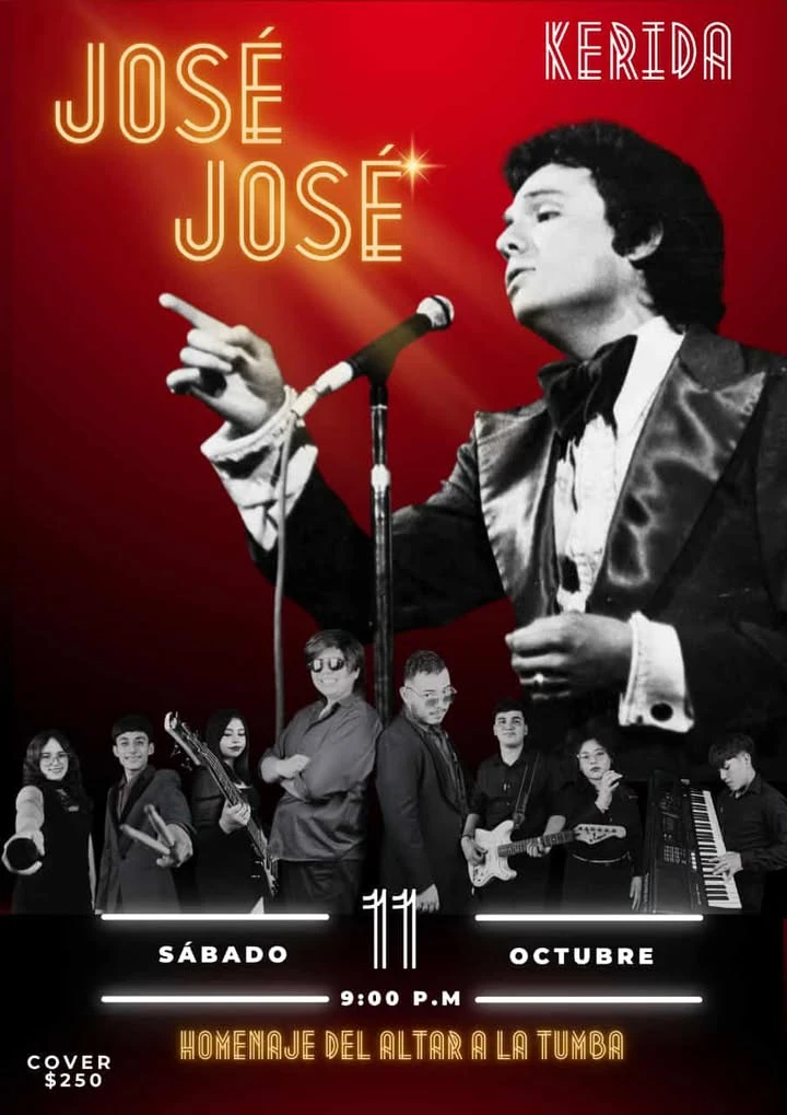 Les hacemos la cordial invitación a esta noche inolvidable en honor al Príncipe de la Canción. Disfruta de un recorrido musical con sus más grandes éxitos, interpretados en vivo. 📅 Fecha: [11/10/25] 🕗 Hora: [9:00pm] 📍 Lugar: [Kerida,bar terraza] ✨ Una velada para cantar, recordar y sentir la música de José José como nunca antes. 📞 Reservaciones: ☎️656-570-7215 ¡No te lo puedes perder!